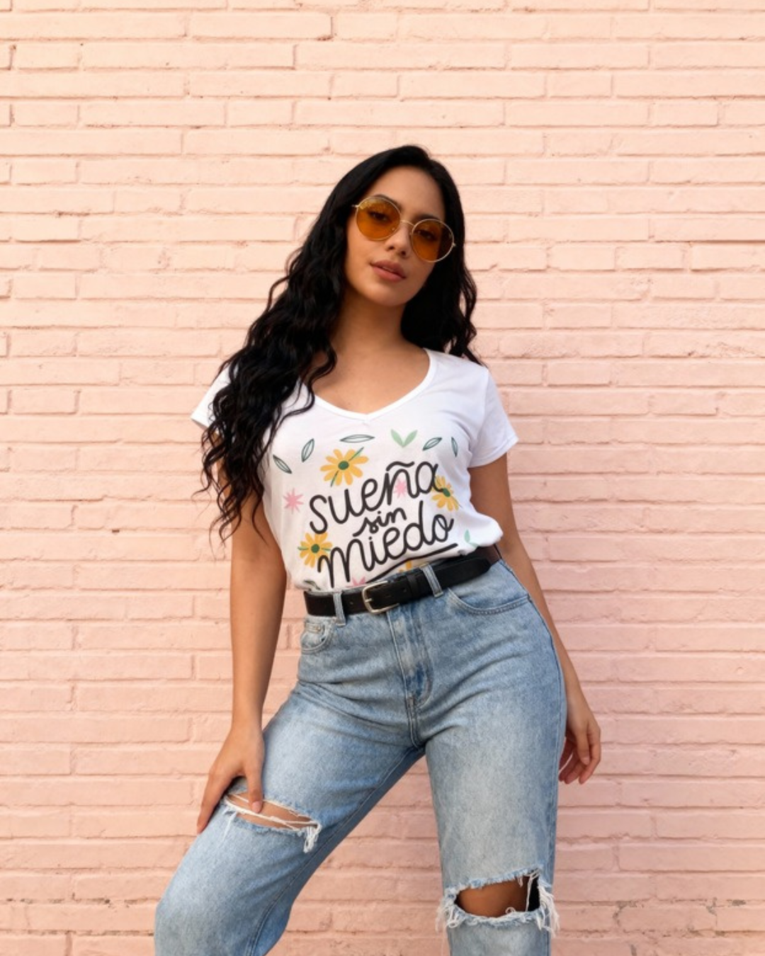 Descubre nuestra remera «Sueña Sin Miedo», una prenda perfecta para expresar tu estilo y actitud positiva. Confeccionada en algodón suave y ligero, esta blusa de corte clásico presenta un atractivo escote en V y mangas cortas, ideal para cualquier ocasión. Su diseño vibrante incluye un estampado colorido de flores que acompaña la inspiradora frase, creando un look fresco y lleno de energía. Combínala fácilmente con jeans o faldas para un acabado casual y chic. ¡Anímate a lucirla y lleva contigo un mensaje motivador todos los días!