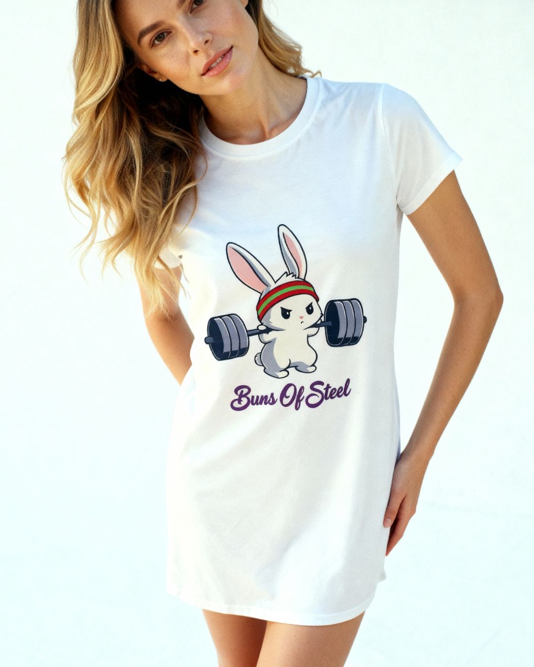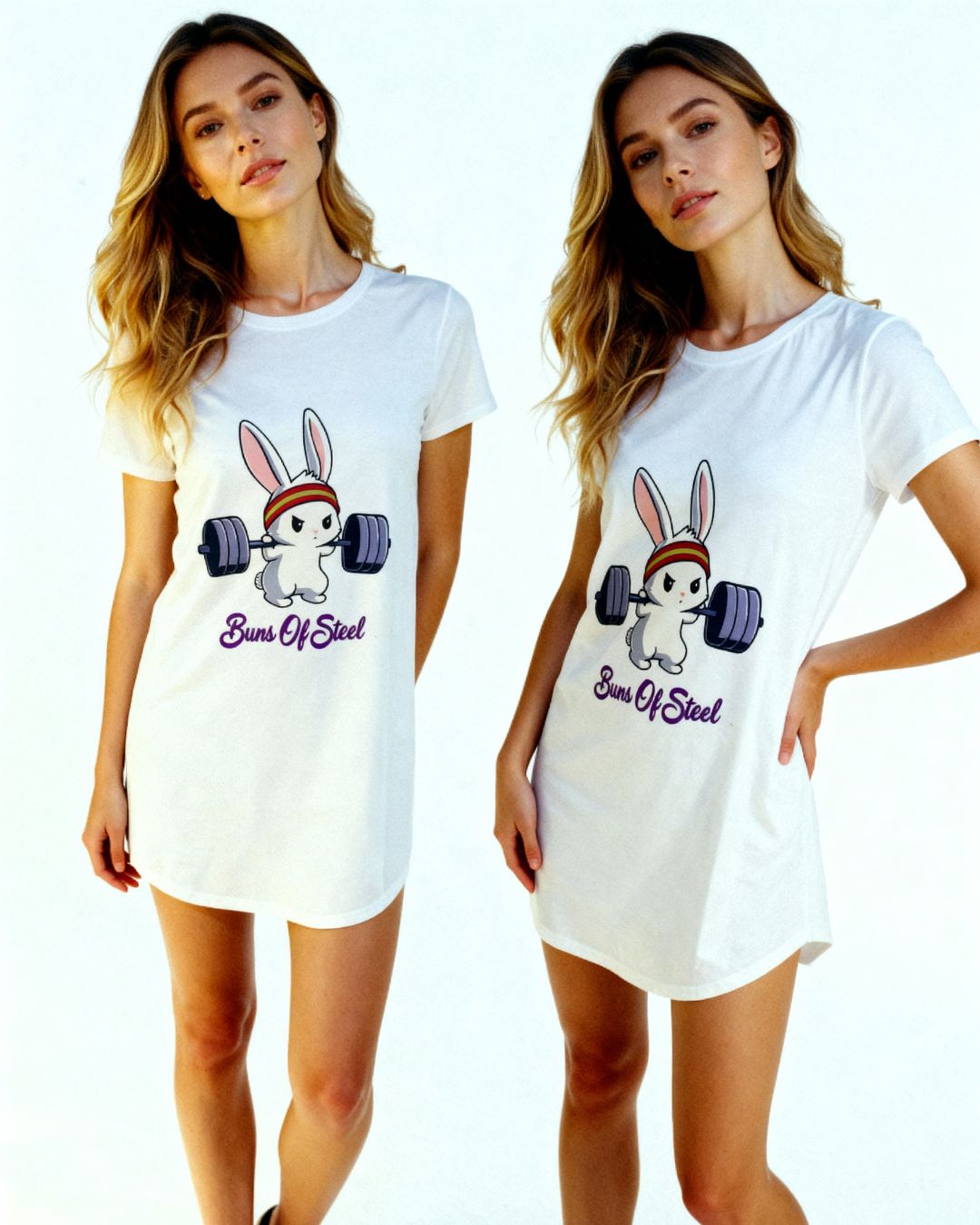 ¡Prepárate para levantar pesas… de risa! Con esta remera pijama “Buns of Steel”, tu rutina de descanso nunca fue tan divertida.
